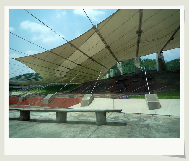河床隆起等地貌,讓此成為地震教育的活教材.車籠埔斷層保存館由82根圓弧型