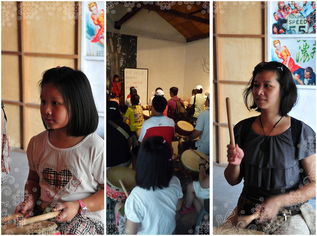 體驗擊鼓的樂趣,沒想到這一大群人也頗有資質,但總有人會"放砲",不過真